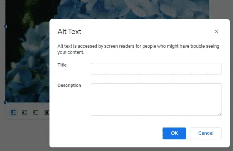 3. In the Alt text-pop up you can write your alt text and an image title.