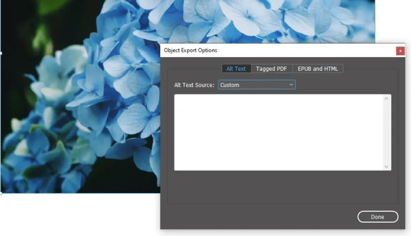 To add alternative text to an image in Adobe InDesign (Version 17 and newer):